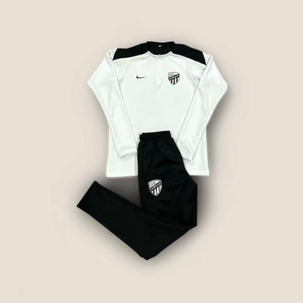 طقم سويتر قطني 100٪ عالي الجودة من متجر النرجس تصميم رياضي أنيق بلون أبيض ناصع مع بنطلون أسود مدمج.